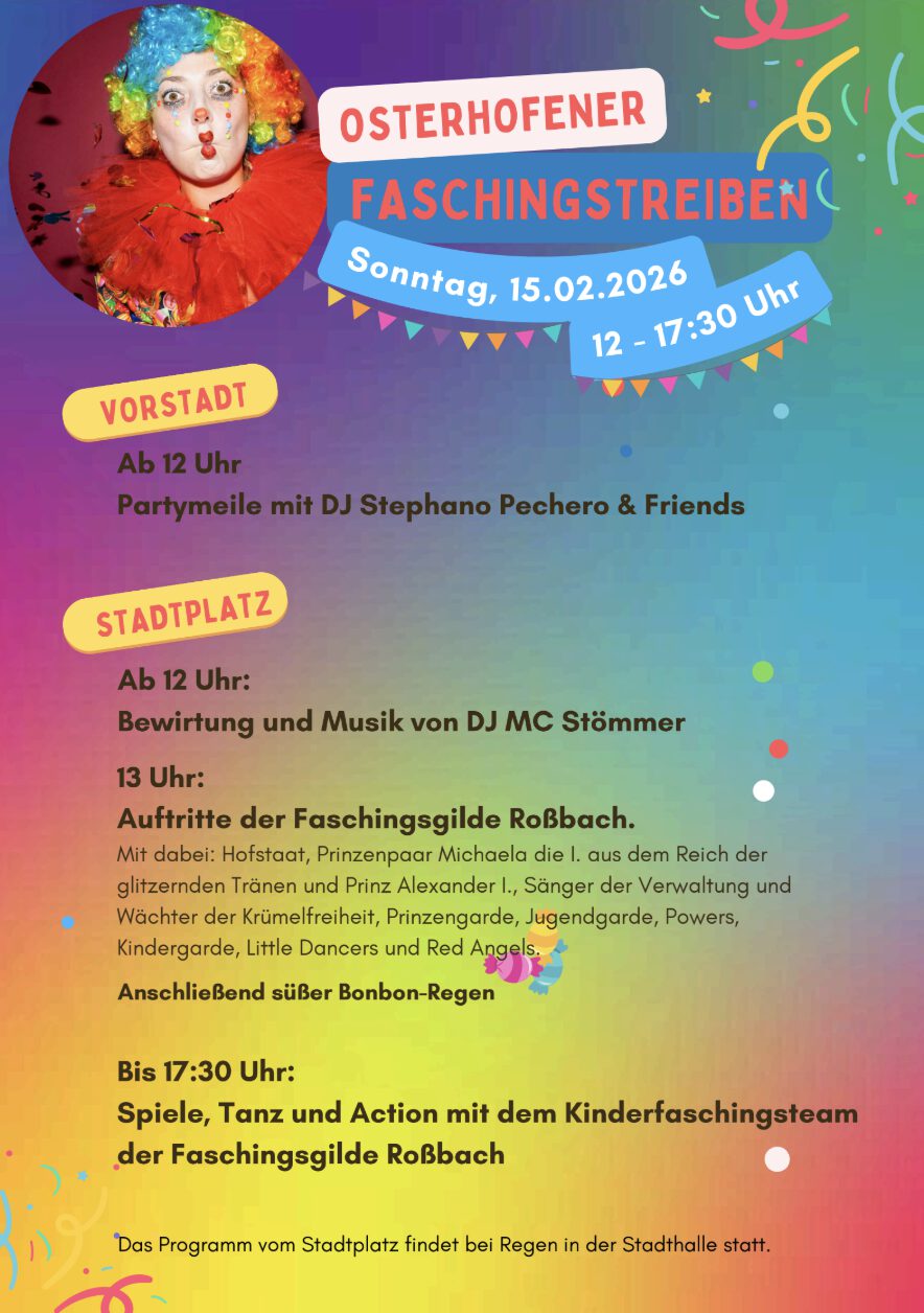 Osterhofen lädt ein: Kommt vorbei, feiert mit, lacht, tanzt und erlebt einen Faschingssonntag, der in Erinnerung bleibt!