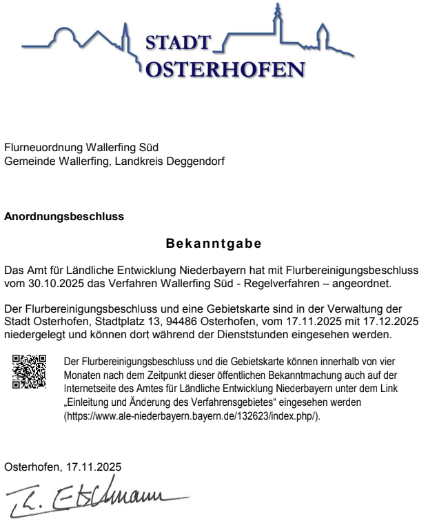Bekanntgabe zur Flurneuordnung Wallerfing Süd