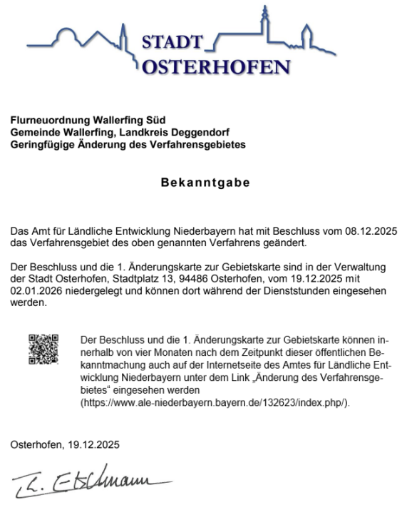 Bekanntgabe zur geringfügigen Änderung des Verfahrensgebietes Flurneuordnung Wallerfing Süd