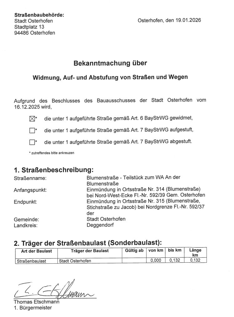 Startseite » Bekanntmachung über Widmung, Auf- und Abstufung von Straßen und Wegen