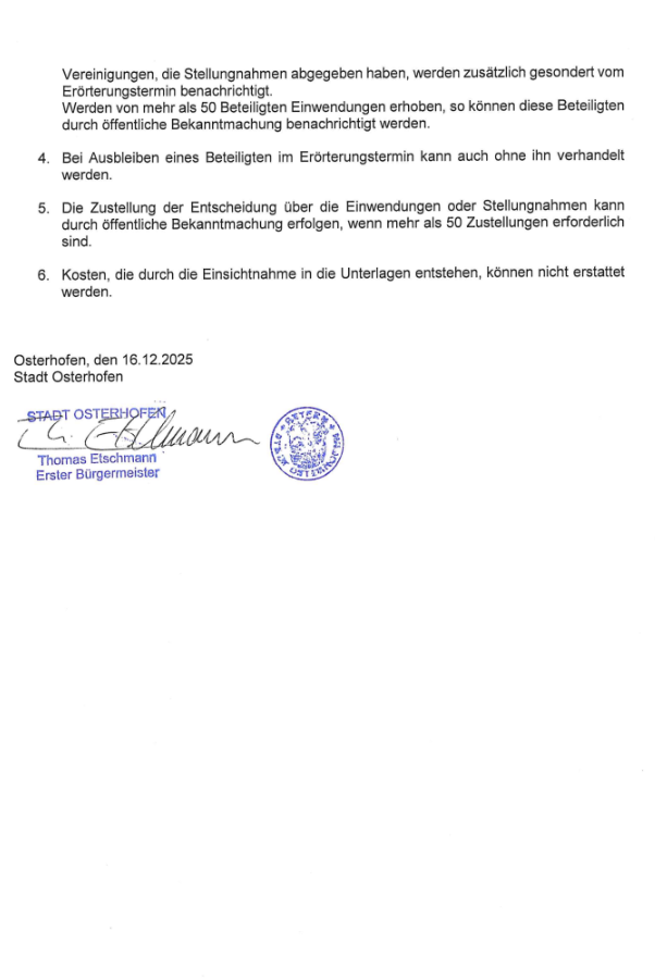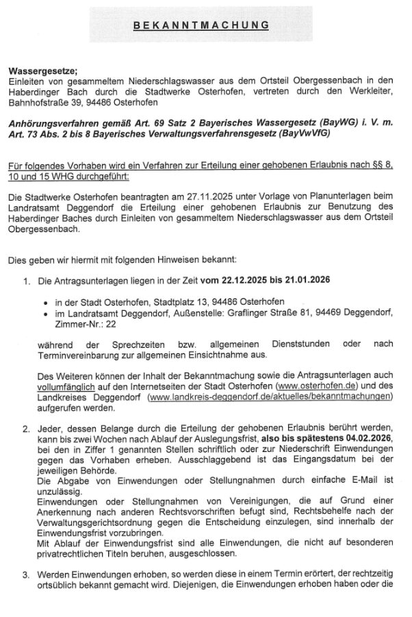 Startseite » Bekanntmachung zum Einleiten von gesammelten Niederschlagswasser aus dem Ortsteil Obergessenbach in den Haberdinger Bach durch die Stadtwerke Osterhofen, vertreten durch den Werkleiter, Bahnhofstraße 39, 94486 Osterhofen