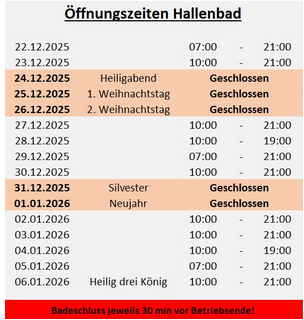 Daher kann das Hallenbad ab 27.12.2025 wieder den Betrieb aufnehmen.