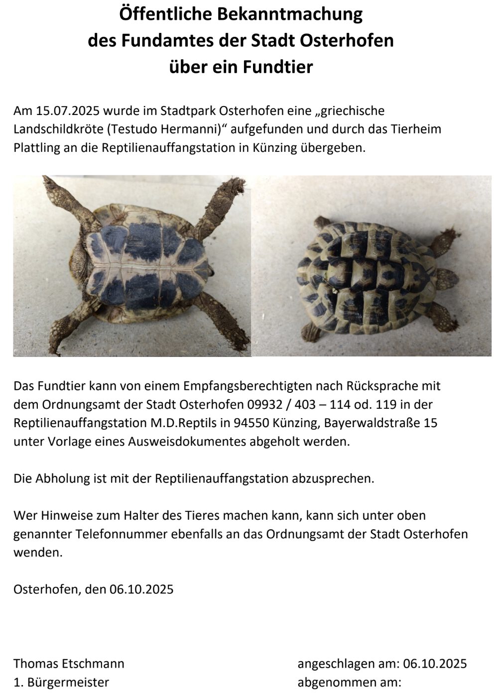 Öffentliche Bekanntmachung des Fundamtes der Stadt Osterhofen über ein Fundtier