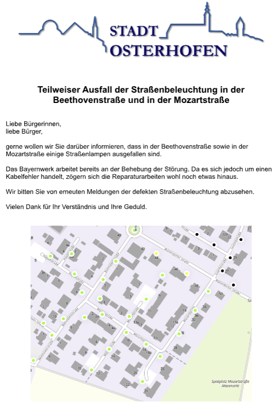 Teilweiser Ausfall der Straßenbeleuchtung in der Beethovenstraße und in der Mozartstraße